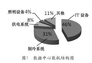 據(jù)美國采暖制冷與空調工程師學會(ASHRAE)技術委員會9.9(簡稱TC9.9)統(tǒng)計報告顯示,數(shù)據(jù)中心各部分的用電量分布大致如圖1所示。由圖可見,IT系統(tǒng)、制冷系統(tǒng)和供電系統(tǒng)是數(shù)據(jù)中心能耗大戶。