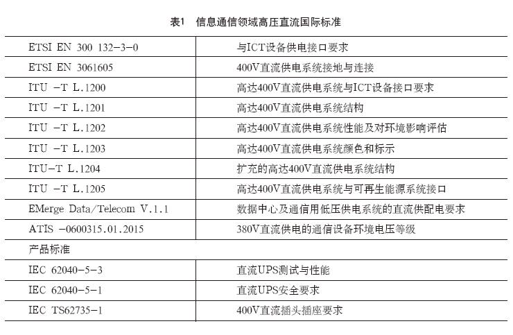 關于高壓直流供電技術國際標準匯總表如表1所示。