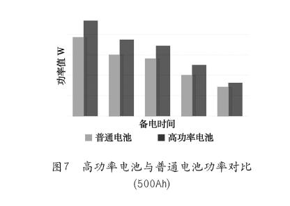 電池的放電倍率是指電池在規(guī)定的時間內放出其額定容量時所需要的電流值,在數(shù)據(jù)值上等于電池額定容量的倍數(shù),通常以字母C表示。如電池的標稱額定容量為600mAh為1C(1倍率),300mAh則為0.5C,6Ah為10C,以此類推。高倍率電池能大電流放電與其極板設計有關,能在大電流放電之后依然能放出電池容量的很大一部分。而普通電池在大電流放電時,只能放出很少一部分能量。圖7為某供應商提供的高倍率電池與普通的閥控式密封鉛酸蓄電池進行放電功率的比較。從數(shù)據(jù)中可以明顯看出,在相同的備電時間,高倍率電池比普通電池的功率值大。