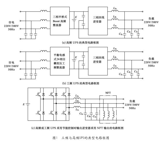 2009年,在《UPS應(yīng)用》的組織發(fā)動(dòng)下,進(jìn)行了一場工頻與高頻UPS的大辯論,結(jié)果是高頻UPS獲勝。工頻UPS失敗的原因是:SCR多相相控整流是一個(gè)時(shí)滯環(huán)節(jié),無法實(shí)現(xiàn)輸出電壓的快速調(diào)節(jié),并會(huì)導(dǎo)致市電電網(wǎng)電壓畸變,對(duì)市電*大,輸入功率因數(shù)低、效率低、體積重量大,直流電壓調(diào)節(jié)為非線性,對(duì)市電電壓波動(dòng)適應(yīng)能力差,不能數(shù)控等而被淘汰。此后,由于采用平衡電感24相自耦變壓工頻整流器和采用自耦變壓器的多相工頻整流與 U d -PWM控制的研制成功,使工頻UPS的性能完全趕上了高頻UPS,但是高頻UPS的開關(guān)損耗要大8~33倍[視高頻UPS的開關(guān)頻率(10~20)kHz,與工頻UPS整流器的相數(shù)(12~24相)而定],這又促使高頻UPS開關(guān)研制出了SPWM節(jié)能控制與軟開關(guān)技術(shù)的應(yīng)用,而SPWM節(jié)能控制又促使高頻UPS的輸出逆變器采用了中性點(diǎn)形成變壓器NFT的應(yīng)用,把高頻UPS的開關(guān)損耗減小了50%以上。至此工頻與高頻UPS的性能已經(jīng)基本相同,并達(dá)到了相當(dāng)高的水平(市電輸入功率因數(shù)PF都達(dá)到了0.999,對(duì)市電電壓波動(dòng)的適應(yīng)能力都達(dá)到了±30%,整機(jī)效率都達(dá)到了94%,體積重量兩者基本相同)。工頻與高頻UPS的典型電路框圖如圖1所示,其中圖(a)為高頻UPS的典型電路框圖,圖(b)為工頻UPS的典型電路框圖,圖(c)為高頻或工頻UPS采用節(jié)能控制時(shí)逆變器采用中性點(diǎn)形成變壓器NFT輸出的電路框圖。