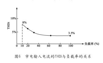 系統(tǒng)負(fù)載率的減小可以使供電系統(tǒng)的效率下降,如圖5所示,也可以是市電輸入電流的THDi增大,如圖6所示,因此對(duì)市電的污染程度也增大了。