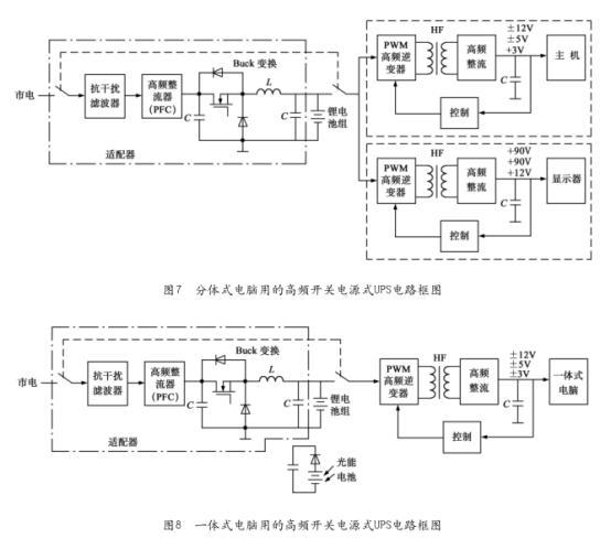 其中圖7所示為專用于分體式電腦的。圖8所示為專用于一體式電腦。因為一般現(xiàn)有的小容量鋰電池組的電壓都比較低,所以必須用Buck DC/DC變換器,使高頻整流器(PFC)的直流輸出電壓與鋰電池組的直流電壓相匹配,以利于鋰電池組充電。由抗*濾波器、高頻整流器(PFC)、Buck變換器組成的電路,由于是高頻開關(guān)電源式UPS電路的一個組成部分,其作用主要是與后面的電路共同完成UPS功能,其次才是對鋰電池組充電,所以叫適配器,不叫充電器,一般把它制成獨立電器作為電腦的一個附件使用。