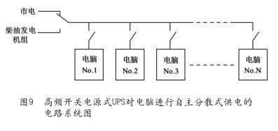 采用高頻開關(guān)電源式UPS,對電腦進行自主分散式供電的電力系統(tǒng)如圖9所示,所謂高頻開關(guān)電源式UPS對電腦進行自主分散式供電,是指 N 臺電腦采用自身專用的高頻開關(guān)電源式UPS,一對一的向電腦供電,都直接接到市電電源上進行工作的一種供電方式。這種供電方式與圖4所示的集中供電方式比較有很多優(yōu)點。