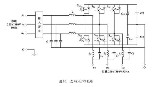對于某些企業(yè)、銀行、醫(yī)院、政府或科研部門,為了延長UPS的供電時間,可以選用電路簡單、成本低、效率高的互動式UPS,其電路如圖10所示。它是由一個三相半橋式逆變器構(gòu)成的、處于熱備用狀態(tài)的UPS。當(dāng)市電正常時,逆變器工作在整流狀態(tài)給蓄電池充電,UPS處于熱備用狀態(tài),負(fù)載由市電電源供電。當(dāng)市電中斷時,逆變器工作在逆變狀態(tài),由蓄電池放電繼續(xù)向負(fù)載供電,此時輸入開關(guān)自動斷開以防止UPS向市電反向饋電。