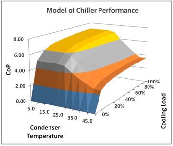 圖3曲線的主要特征是當冷凝器溫度升高超過30°C時,當冷卻負荷接近100%時,能效比急劇下降。在圖3中的冷水機組的復(fù)雜性是一個單一的子系統(tǒng)組件中集中了各種數(shù)據(jù)中心的關(guān)鍵組件,這些組件的設(shè)備中的功率和熱量的分布之間相互作用。例如,制冷機組在冷卻負荷時從配電板或面板的電源進行供電,表示機械裝置和電氣裝置之間的相互作用。