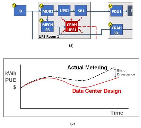 在圖5的(a)中所示的例子中,儀表被提名和數(shù)據(jù)中心的關(guān)鍵性能指標(KPI)跟蹤與預(yù)期設(shè)計性能(參見圖5b)。區(qū)別在哪里開始,見圖(5b)。它只是通過繪制的健康預(yù)期的設(shè)計從模型讀取可見。發(fā)散的常見原因是人工干預(yù),其中有人已經(jīng)改變了設(shè)置,冷卻系統(tǒng)或系統(tǒng)已經(jīng)響應(yīng)產(chǎn)生不利于載荷狀況,但只是在一定程度上還尚未成為危險項目。如果早按照圖5檢測(b)所示,設(shè)施人員能及時處理,并試圖恢復(fù)分歧的差距,并將數(shù)據(jù)中心帶回到設(shè)計。