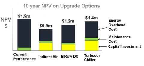該模型需要從所有的主要數(shù)據(jù)中心項目的性能和數(shù)據(jù)的輸入,以允許在一個組件和/或系統(tǒng)級的數(shù)據(jù)中心容量利用率的評估。它有助于數(shù)據(jù)中心的計劃,并為即將到來的基礎(chǔ)設(shè)施維護和增強計劃,它可以幫助評估設(shè)施升級選項,而不需要長期的、復(fù)雜的、充滿錯誤的電子表格。圖8給出了一個10年的凈現(xiàn)值(NPV)為冷卻系統(tǒng)升級的計算,考慮到對能源的開銷,維修成本和所需的資本投資。在這種情況下,它很容易在較短的時間內(nèi)評估升級選項的內(nèi)部工程團隊,并排除那些不提供一個成本效益的商業(yè)案例。在圖8的基礎(chǔ)上,安裝Turbocor制冷機組10年以上將對成本沒有什么影響,而采用間接冷卻系統(tǒng)可以節(jié)約60萬美元。