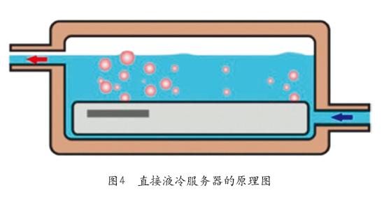 直接液冷服務(wù)器又叫浸沒式液冷服務(wù)器,其原理圖如圖4所示。如圖中所示,發(fā)熱元器件與冷媒直接接觸,即將服務(wù)器主板、CPU、內(nèi)存等發(fā)熱量大的元器件完全浸沒在冷媒中。由于冷卻液與被冷卻對象直接接觸,散熱效果更佳,能一次性解決全部元器件的散熱問題,無須額外配置風扇、散熱片等。但此系統(tǒng)對原有的風冷系統(tǒng)有較大改動,需制作密封艙體用來盛放冷媒。另外,對冷媒的要求較高,需具備絕緣性好(不導(dǎo)電)、無毒無害、無腐蝕性等物理化學(xué)特性。