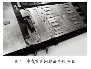 神威藍光公司的間接液冷服務(wù)器中的冷卻用水是內(nèi)部封閉循環(huán),是來自礦泉水廠處理過的純水。中間是鋁制液冷散熱板。神威藍光公司的間接液冷服務(wù)器的優(yōu)勢是集成度高,水冷散熱高效,可在一個機柜內(nèi)存放更多的CPU,僅依靠9個運算機柜就達到了很高的運算能力。神威藍光間接液冷服務(wù)器如圖7所示。
