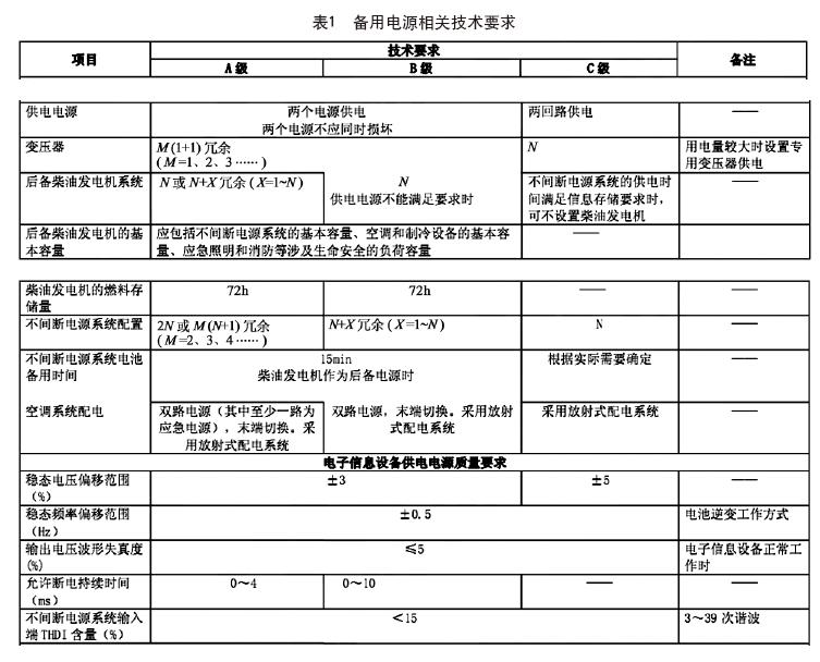 GB50174標(biāo)準(zhǔn)中與后備電源相關(guān)的技術(shù)要求如表1所示。