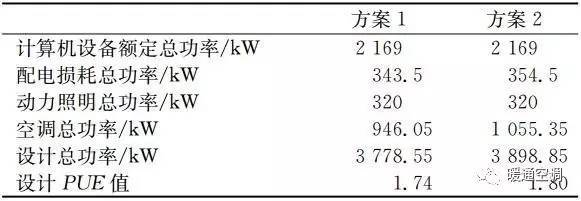 由設(shè)計(jì)PUE值可以看出,方案1設(shè)計(jì)PUE值低于方案2設(shè)計(jì)PUE值。