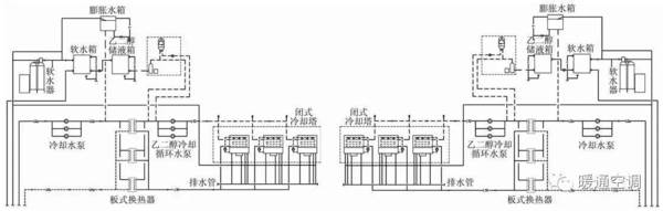 乙二醇水溶液循環(huán)系統(tǒng)采用定壓罐定壓、補(bǔ)液;清水循環(huán)系統(tǒng)采用膨脹水箱定壓、補(bǔ)水,補(bǔ)水均采用軟化水。冷卻水系統(tǒng)采用全程水處理裝置除垢,以保證水質(zhì)穩(wěn)定。冷卻水系統(tǒng)的高位設(shè)自動排氣閥、低位設(shè)排污閥。