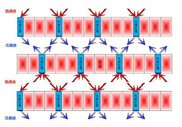 列間機(jī)房空調(diào)的設(shè)計(jì),冷風(fēng)是從冷通道送風(fēng)、后由熱通道回風(fēng)的水平送風(fēng)方式,從而完全解決了冷熱氣流短路的問(wèn)題,保障了服務(wù)器機(jī)柜溫度的均勻,消除了局部熱點(diǎn),進(jìn)而增加了服務(wù)器的運(yùn)行可靠性同時(shí)有效的降低了不必要的能耗。