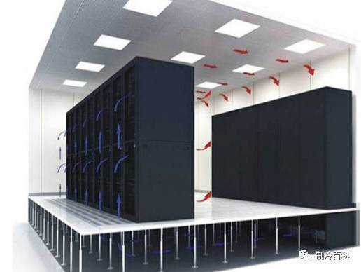 在這樣的布局中,冷風(fēng)首先送入地板下的靜壓箱,通過出風(fēng)地板進(jìn)入服務(wù)器機(jī)柜進(jìn)行冷卻IT設(shè)備,從機(jī)柜中排出的熱風(fēng),進(jìn)入機(jī)房空間,經(jīng)由機(jī)房空間自然回風(fēng)至空調(diào),或經(jīng)過天花板空間回風(fēng)至空調(diào)進(jìn)行制冷。