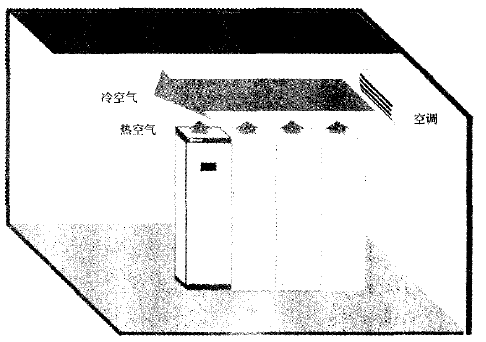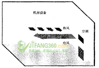 如圖1所示,當(dāng)前通信設(shè)備多采用風(fēng)扇冷卻方式。且通常采用前端進(jìn)風(fēng),后端出風(fēng)的形式??照{(diào)的出風(fēng)口對(duì)準(zhǔn)設(shè)備后方,冷空氣與從設(shè)備內(nèi)出來的熱風(fēng)會(huì)合,會(huì)很快使氣溫降低,但空調(diào)的高速出風(fēng),會(huì)對(duì)通信設(shè)備熱空氣的排出產(chǎn)生一個(gè)風(fēng)阻,削弱了通信設(shè)備熱空氣的排出速度,使得熱空氣在通信設(shè)備內(nèi)(尤其是模塊設(shè)備,如電源模塊)產(chǎn)生滯留,從而使設(shè)備內(nèi)局部溫度升高。因此,在這種情況下,會(huì)造成環(huán)境溫度低,而設(shè)備內(nèi)溫度高的“似低溫環(huán)境”現(xiàn)象,不利于設(shè)備的健康使用。有的用戶在此方式下,甚至打開后門讓空調(diào)風(fēng)對(duì)著面吹,以為利于設(shè)備散熱。根據(jù)電源廠家對(duì)這種情況與空調(diào)側(cè)吹的情況做了溫升對(duì)比,對(duì)比對(duì)象為在同一負(fù)載條件下同型號(hào)的兩套通信電源系統(tǒng)的模塊機(jī)內(nèi)溫度??照{(diào)前面?zhèn)却档南到y(tǒng),在模塊后內(nèi)側(cè)1寸處空氣溫升約為13℃,而打開后門對(duì)里面正吹的電源,雖然感覺不到電源設(shè)備發(fā)熱,但模塊內(nèi)相同位置的溫升卻達(dá)到15℃~16℃,并沒有使電源模塊的散熱得到合理改善。