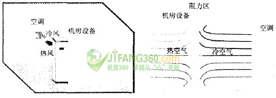 如圖2所示,在這種方式下,空調(diào)掃風(fēng)和氣流擴(kuò)散從側(cè)面對(duì)通信設(shè)備后面產(chǎn)生反壓,仍然會(huì)對(duì)通信設(shè)備熱空氣從后面排出產(chǎn)生一個(gè)風(fēng)阻,同第1種方式一樣,也會(huì)造成環(huán)境溫度低,而設(shè)備內(nèi)溫度高的“假低溫環(huán)境”現(xiàn)象,不利于設(shè)備的健康使用。