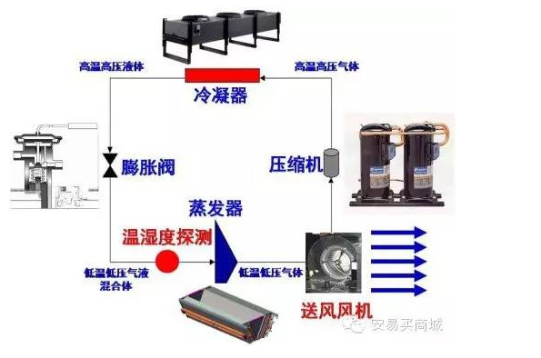 一般來(lái)說(shuō)空調(diào)機(jī)的制冷過(guò)程為:壓縮機(jī)將經(jīng)過(guò)蒸發(fā)器后吸收了熱能的制冷劑氣體壓縮成高壓氣體,然后送到室外機(jī)的冷凝器;冷凝器將高溫高壓氣體的熱能通過(guò)風(fēng)扇向周圍空氣中釋放,使高溫高壓的氣體制冷劑重新凝結(jié)成液體,然后送到膨脹閥;膨脹閥將冷凝器管道送來(lái)的液體制冷劑降溫后變成液、氣混合態(tài)的制冷劑,然后送到蒸發(fā)器回路中去;蒸發(fā)器將液、氣混合態(tài)的制冷劑通過(guò)吸收機(jī)房環(huán)境中的熱量重新蒸發(fā)成氣態(tài)制冷劑,然后又送回到壓縮機(jī),重復(fù)前面的過(guò)程。