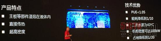 同時在曙光技術(shù)大會上展示了另一款高能效的技術(shù),全液冷產(chǎn)品。該產(chǎn)品現(xiàn)在還處于研發(fā)階段,主板等部件全部浸泡在無腐蝕不燃導(dǎo)熱性佳的液體里,展區(qū)工作人員表示該液體主要成分是油,可大幅降低能耗,相比傳統(tǒng)數(shù)據(jù)中心能耗降低90%以上,PUE可達1.05以下。