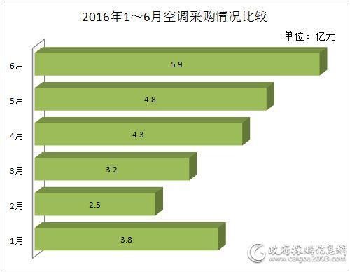 上半年,各月空調(diào)采購(gòu)規(guī)模分別為3.8億元、2.5億元、3.2億元、4.3億元、4.8億元和6億元。